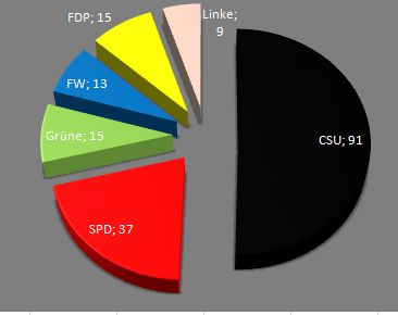 CSU 49% / SPD 20 % / Grüne 8 % / FDP 8 % / Linke 5 % / FW 7 %