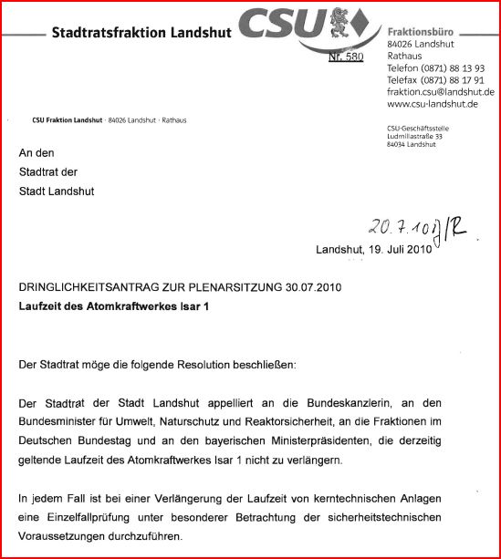 Das Bündnis für Dachau möchte die CSU-Stadtratsfraktion in Landshut in Ihrem Kampf gegen die Laufzeitverlängerung des Kernkraftwerks Isar I unterstützen und beantragt, dass der Dachauer Stadtrat die von der CSU-Fraktion in Landshut formulierte Resolution gemäß Anlage beschließen sollte.