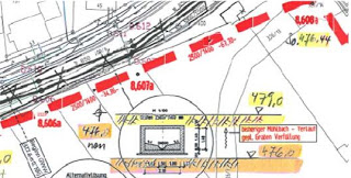 Falls es zum Bau der Bahnunterführung kommt, ist die Verlegung des Hauptsammlers zum Regenüberlaufbecken (RÜB) zwingend. Der Kanal muss parallel zur Straße zum Becken geführt werden. Die Höhenlage dieses Kanales ist durch den Bestand vorgegeben. Hiervon kann nicht abgewichen werden. Sollte, wie von der DEG geplant, das MD – Gelände um drei Meter abgesenkt werden, würde der neue Kanal in der Luft schweben. s. Skizze