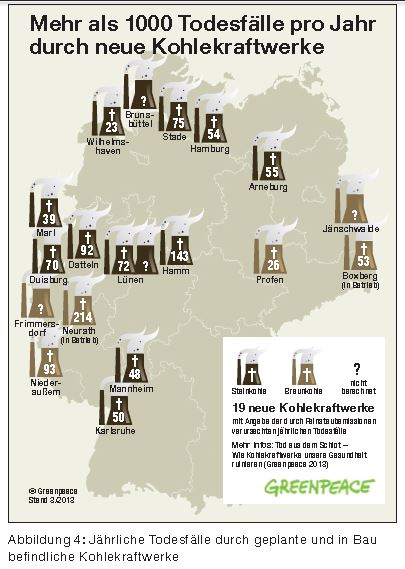 Diese rechnerisch ermittelten Zahlen prognostiziert das von der Umweltorganisation Greenpeace in Auftrag gegebene und am 03. April 2013 veröffentlichte Gutachten „Tod aus dem Schlot, wie Kohlekraftwerke unsere Gesundheit ruinieren“ für den Fall, dass das Kohlekraftwerk am Stummhafen in Lünen ans Netz gehen sollte.