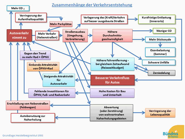 Der Dachauer Stadtrat wird sich bald dieser Problematik stellen müssen. Zur Einstimmung eine animierte Grafik wie komplex Autoverkehr ist. Und wie durch besseren Verkehrsfluss mehr Autoverkehr entsteht. Denn nicht nur neue Straßen erzeugen mehr Verkehr.