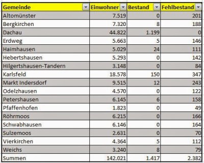 Die Stadt Dachau stellt mit 44.822 nicht die größte Einwohneranzahl sondern auch 1.199 Sozialwohnungen und kommt so auf ein Quote von 2,7% Sozialwohnungen/Einwohner.