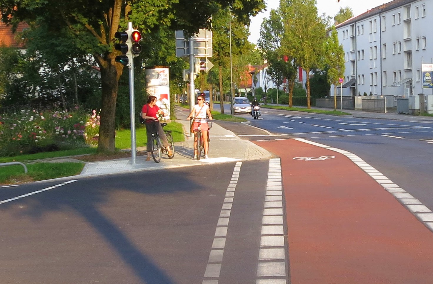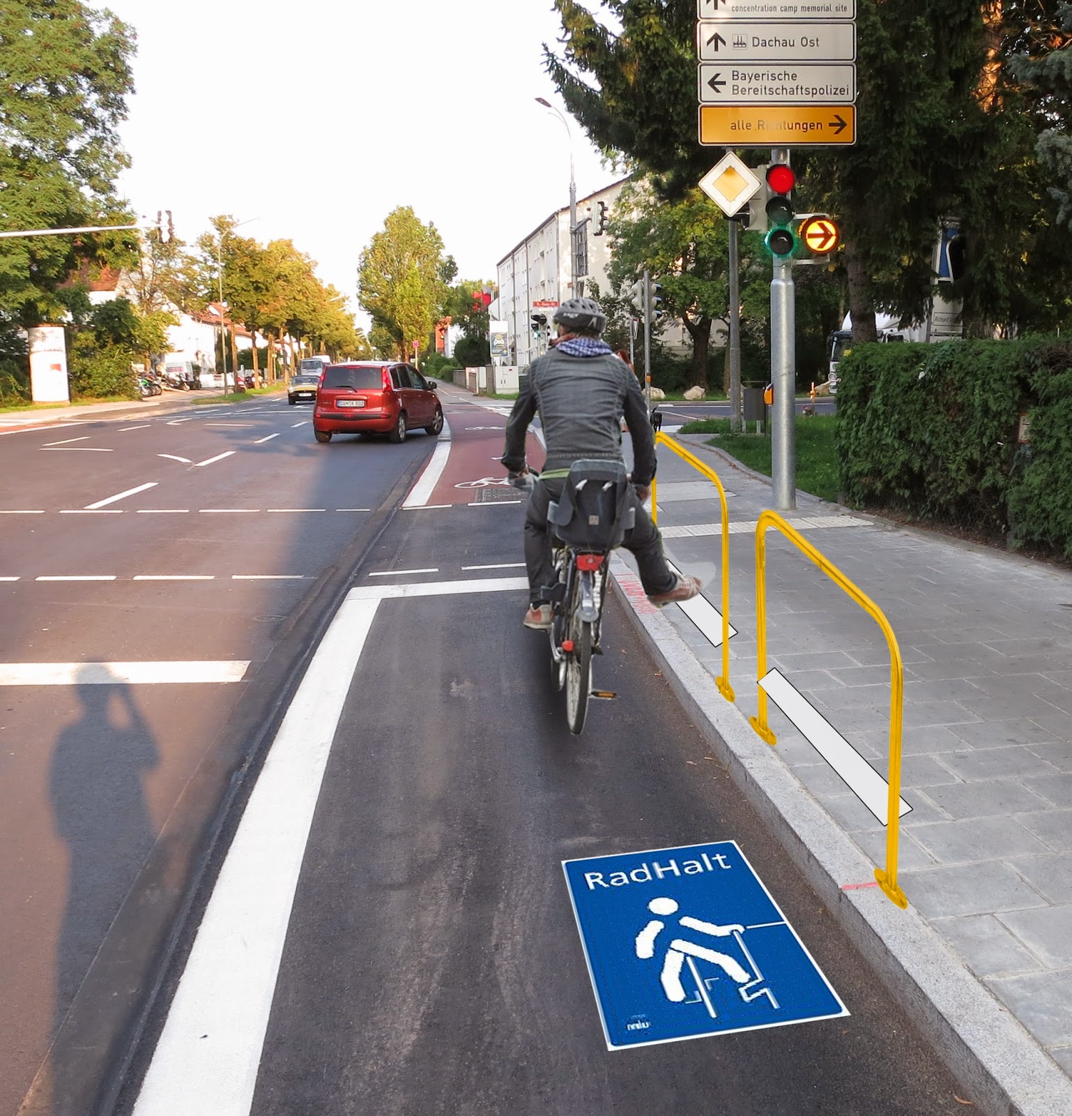 Barrierefrei und für Dachauer Verhältnisse geradezu bahnbrechend, ein vorgezogener Haltestreifen für Radfahrer. Damit bleiben Radfahrer beim Warten im Sichtbereich der Autos. Gut so. Insbesondere weil in absehbarer Zeit für Radfahrer sowieso die Autofahrerampel gilt.