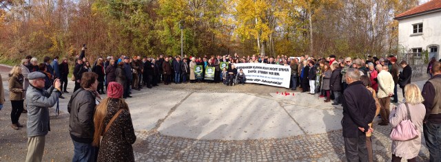 Mahnwache des „Runden Tisch gegen Rassismus“ vor dem Eingang zur Gedenkstätte mit dem geschändeten Tor, heute 9. November.