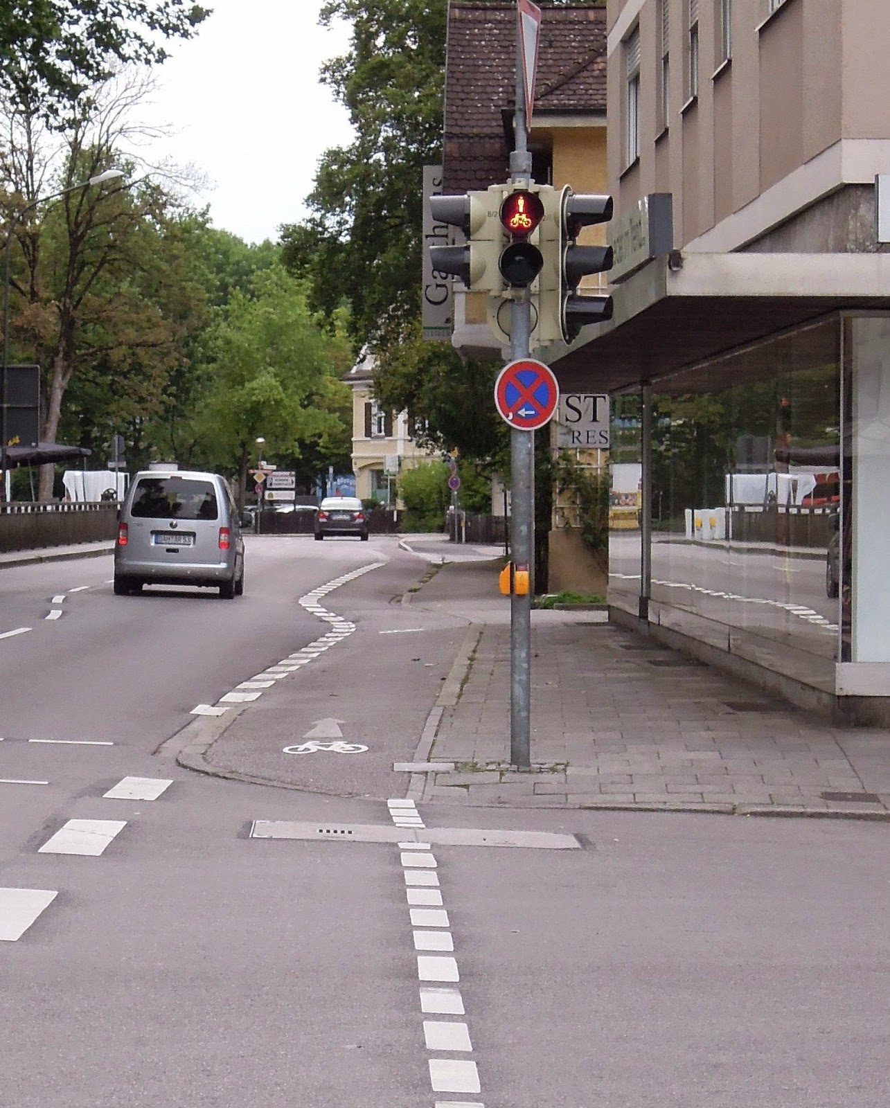 Gemäß der Regelung, dass nach 2016 Ampeln für den Autoverkehr genauso für Radfahrer gelten, ist die bestehende Radinfrastruktur konsequent so anzulegen, dass an Ampelanlagen Missverständnisse vermieden werden. Dies gilt besonders für kombinierte Fuß-, Radampeln.