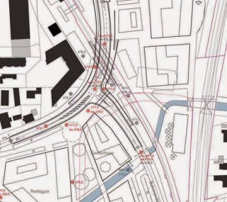 Hintergrund: Wie im Bild rechts zu sehen ist, wird der Mühlbach nach Süden verlegt um eine Rampe zur geplanten Bahnunterführung S-Bahnlinie-A zu ermöglichen.