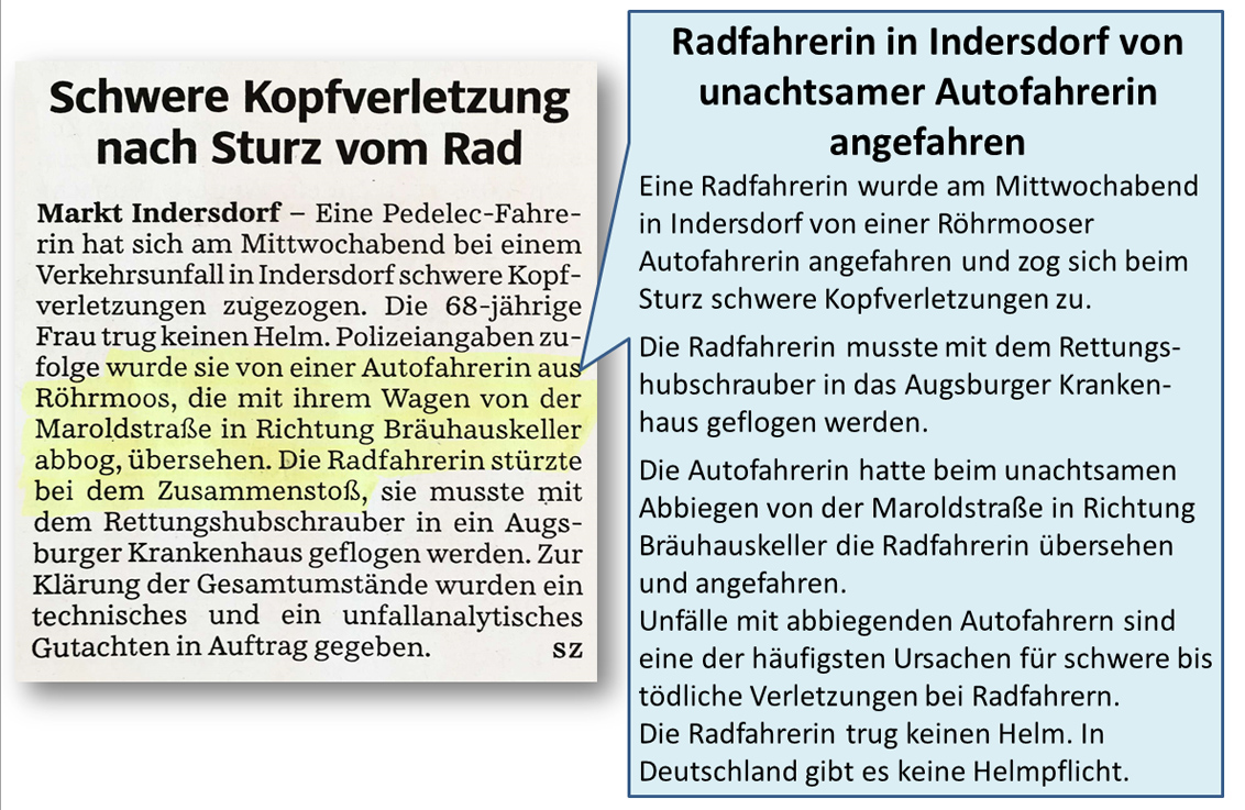 Warum werden Presseberichte mit Unfällen von Radfahrern so geschrieben, dass der Eindruck entstehen muss, der/die RadfahrerIn wäre selber schuld und der Autofahrer lediglich unachtsam?