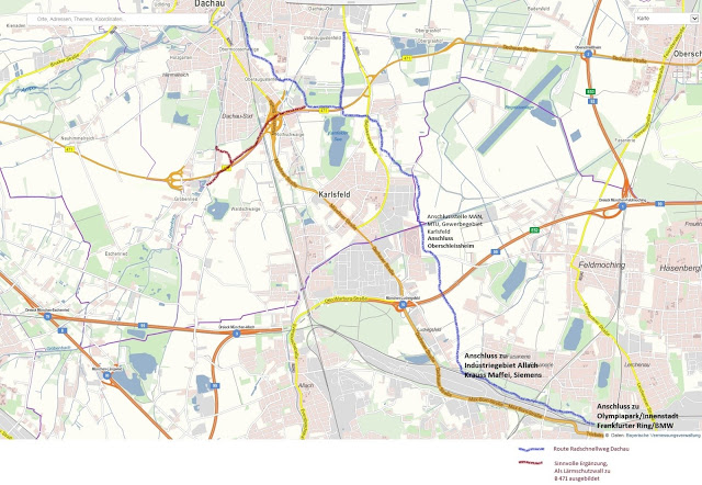 Das Bündnis für Dachau stellt dazu im Folgenden eine grobe Routenwahl vor, die geeignet wäre wichtige Wohnorte mit wichtigen Gewerbestandorten, Naherholungszielen und anderen Zielen zu verbinden und gleichzeitig eine breite Abdeckung von Quell- und Zielbeziehungen zu gewähleisten.