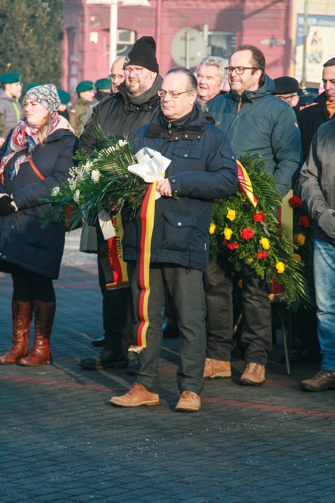 Vertreter der Partnerstädte aus Italien Cori und Arezzo, aus Frankreich Ballan-Mire, aus Deutschland Kerpen, Dachau und Hannover und der ukrainischen Stadt Sambora gedachten auf dem Kosciuszkoplatz der Opfer des Zweiten Weltkrieges.