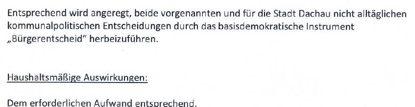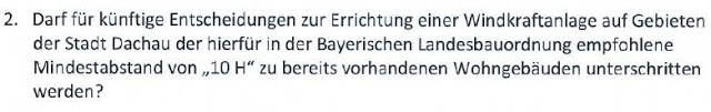 Diese Frage ist überhaupt nicht zulässig, denn das ist in einem Gesetz geregelt. Die Bürger Dachaus können nicht über ein Gesetz in einem Bürgerentscheid abstimmen.