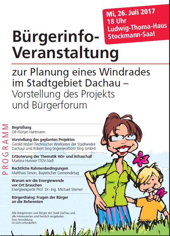 18. Juli 2017. Am Mittwoch, den 26. Juli 2017 findet um 18.00 Uhr im Ludwig-Thoma-Haus eine Bürgerinformationsveranstaltung statt, auf der der momentane Stand der Planung für ein mögliches Windrad im Stadtgebiet Dachau und die weiteren geplanten Schritte detailliert vorgestellt werden. Dabei werden besonders die Themen Schall, Schatten, Artenschutz und das Baurecht erläutert. Im Rahmen der Informationsveranstaltung haben alle Bürgerinnen und Bürger die Möglichkeit, ihre Fragen zum Thema Erzeugung von Erneuerbaren Energien vor Ort zu stellen. Die Veranstaltung findet im Stockmann-Saal statt, eine Anmeldung ist nicht erforderlich.