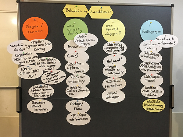 In der darauffolgenden Diskussion wurden in zahlreichen Redebeiträgen nicht nur das Für-und-Wider abgewogen, sondern auch die damit verbundenen Fragen und Bedingungen erörtert. Um den Mitgliedern ein plastisches Bild zu bieten, steckten die Vorstände Margot Heinze-Ehrlich und Lena Wirthmüller alle Beiträge und Antworten als Schaubild an eine Pinnwand. Dabei stand dann unter der Rubrik Fragen: „Schadet das den anderen ökologisch orientierten Parteien?“, „Wird es Gemeinschaftslisten mit anderen freien Ortsgruppen geben?“ oder „Gibt es eine Alternative zu einer eigenen Liste?“. Unter den Gegenargumenten waren hauptsächlich „Aufwand“, „Doppelmandat zu anstrengend?“ oder „Wahlkampf doppelt so teuer?“ zu finden. Als Bedingungen formulierten die Mitglieder Punkte wie „Angemessene Berücksichtigung aller Kommunen“, „Eigenes Wahlprogramm für die Kreistagswahl“ und eine „Satzungsänderung“.