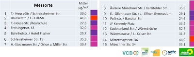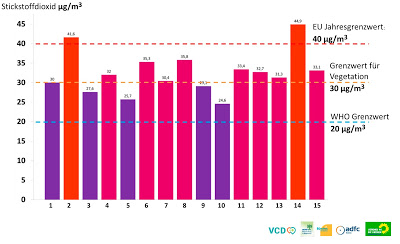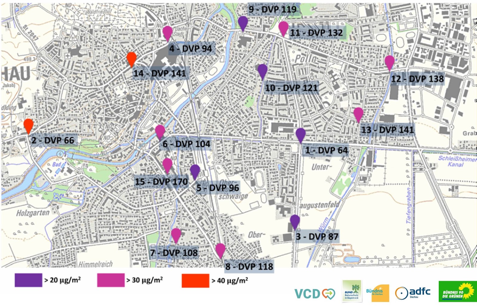 Ein Aktionsbündnis bestehend aus Mitglieder des VCD Verkehrsclub Deutschland, ADFC Allgemeiner Deutscher Fahrradclub, BUND Naturschutz Dachau, Bündnis für Dachau und Bündnis 90/Die Grünen sowie verschiedene Einzelpersonen haben von Oktober bis November 2017 die Stickoxid-Werte (NO2) in Dachau gemessen.