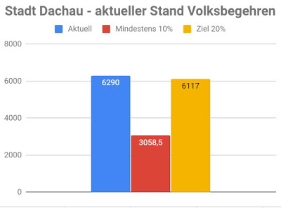 Bis gestern Abend konnte die Stadt Dachau 6290 Eintragungen verzeichnen. Das ist mehr als doppelt so viel als mindestens für den Bayern weiten Schnitt gefordert sind, umgerechnet 20,57% Weiterhin ist jede Stimme wichtig um den Vertetern des Volksbegehrens den Rücken bei den Verhandlungen mit Söder und seinen Teil der Bauern zu stärken.