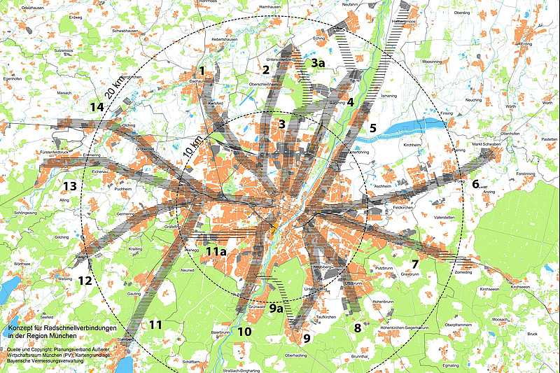 Zur Historie. Der Planungsverband München hat 2015 eine Potentialanalyse zu Rad-Schnellwegen im Münchner Umland erstellt. Das Ergebnis: 14 Korridore, jeder zwischen 11 und 25 km lang, radial auf die Stadt ausgerichtet. Ein weiteres Ergebnis war die Festlegung auf einer Pilotstrecke zwischen der Hochschule in Garching und der Münchner Stadtgrenze. Dieses Pilotprojekt ist nun schon in der Phase in der Detaillösungen diskutiert werden.