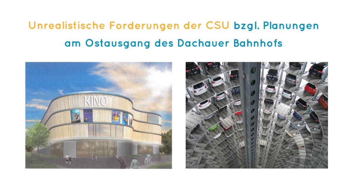 Im Sitzungsverlauf zeigte sich dann die ganze Orientierungslosigkeit der Dachauer CSU. Die negativen Ergebnisse eines Verkehrsgutachtens zur Machbarkeit eines 600 Stellplatz-Parkhaus wurden als nicht ausreichend bezeichnet. Um die 600 Stellplätze zu erhalten, hätte die CSU sogar ein Linksabbiege-Verbot zur Friedensstraße in Kauf genommen. Nachdem in der Diskussion klar wurde, dass die Forderungen der CSU nicht haltbar sind, wurde auf Verzögerungstaktik umgeschwenkt. Entscheidungen sollten vertagt werden. Sogar die Ansiedlung des Dachauer Kinos direkt an den Bahnhof wurde in Frage gestellt – Wirtschaftsförderung sieht unserem Erachten anders aus.