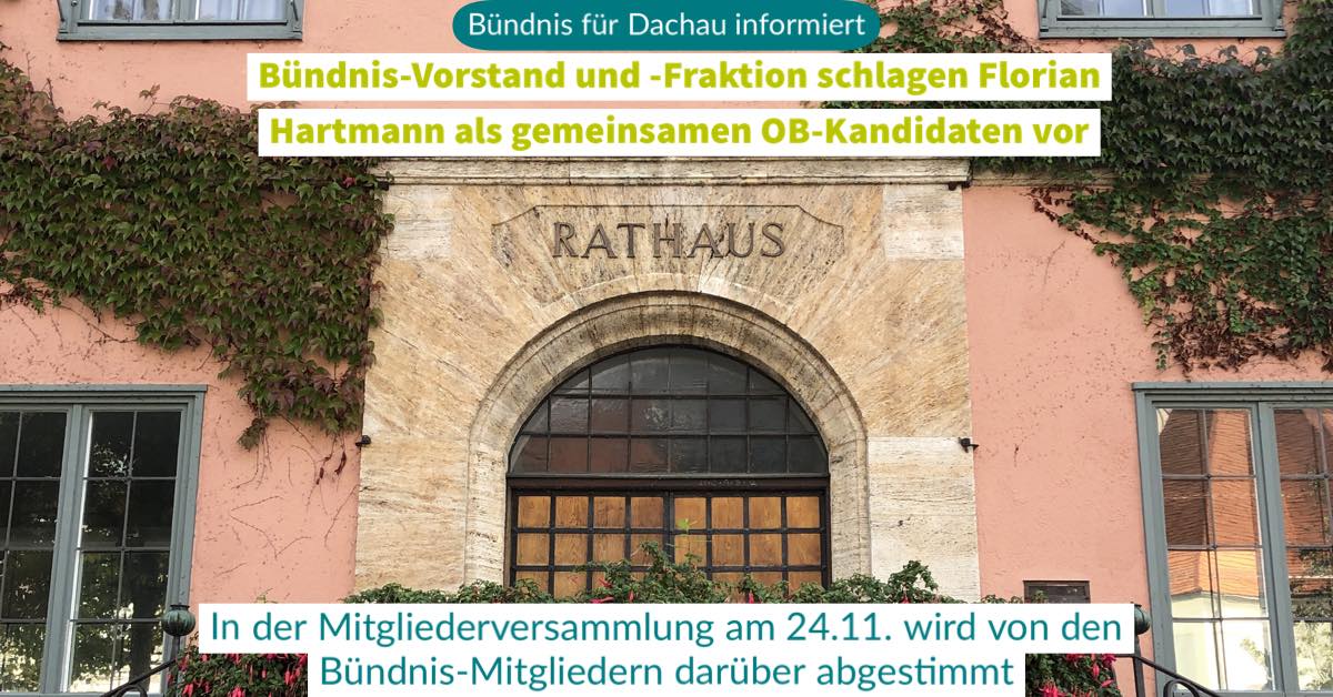 Deswegen wird das Bündnis auf der Mitgliederversammlung am 24.11.2019 vorschlagen, Florian Hartmann zum gemeinsamen Kandidat von SPD, Bündnis 90/Die Grünen und Bündnis für Dachau zu nominieren.