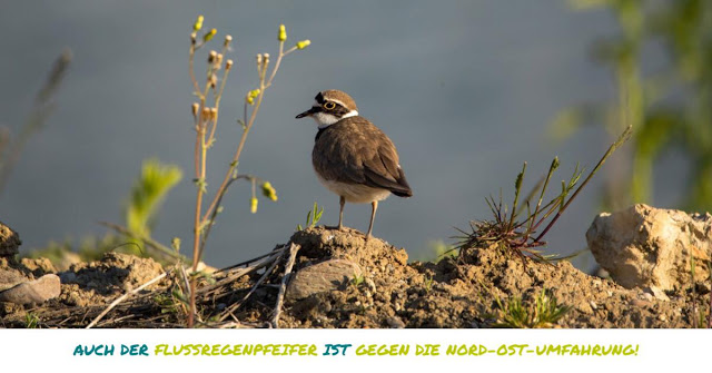 Der Flussregenpfeifer lebte ursprünglich auf Schlamm-, Sand-, Kiesbänken europäischer Flusssysteme. Aus Mangel an geeigneten Lebensräumen wurden immer mehr Baggerseen, Industriebrachen oder Kiesgruben zum Ausweichhabitat dieser Art. Im Winter von November bis Februar ist der Langstreckenzieher, im Mittelmeerraum und in Afrika anzutreffen. Zu den Überwinterungsquartieren zählt der Süden der Sahara bis zur Küste Westafrikas, Zaire, Tansania und Kenia. In der Sulida zwischen Dachau und Hebertshausen gibt es ca. 5 Brutpaare dieser seltenen Vogelart. Die offenen Kiesflächen nahe am Gewerbegebiet Dachau gehören zu seinem Bruthabitat. Die Trasse der geplanten Nord-Ost-Umfahrung wurde exakt durch diese Fläche geplant und würde diesem seltenen Vogel den Lebensraum nehmen.