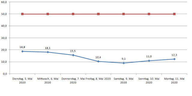 Die Tabellen der Tage zuvor waren noch mit 152.894 EW gerechnet. Einen Trend kann man wahrscheinlich erst ab Donnerstag 14.05. erkennen.