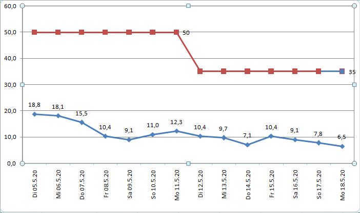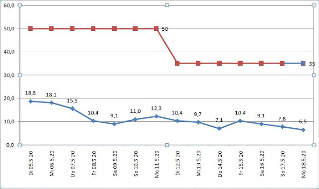 Der Schnitt der letzten 7 Tage Neuinfizierte pro 100.000 EW im Dachauer Landkreis mit den Werten vom Wochenende zeigt eine Tendenz nach unten, wirklich spannend wird es dann am Freitag, da könnte es einen deutlcihen Sprung geben.