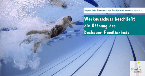 Die Stadtwerke haben keinesfalls leichtfertig die Öffnung verzögert. Es geht hier immerhin um 200.000 EUR Mehrkosten und ein solcher Posten muss einfach erst vom Stadtrat freigegeben werden. Die Stadtwerkeführung hat sehr schlüssig ausgeführt welche Gründe zu den Verzögerungen geführt haben. Die beauftragte Firma hat noch im Jahr zuvor sehr zuverlässig Sanierungsarbeiten im Dachauer Hallenbad durchgeführt. Als die Firma in Verzug gekommen ist, haben sogar die Stadtwerke Mitarbeiter freiwillig das Abschlagen der Fliesen übernommen, um eine rechtzeitige Öffnung des Bades zu ermöglichen. Es gebührt den Mitarbeitern der Stadtwerke ein großes Dankeschön.