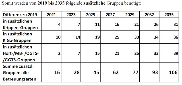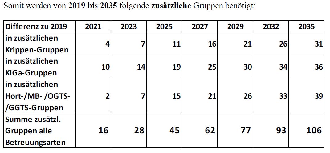 Auf Basis des „Modell MW“ (d.h. mit Wanderung) der Bevölkerungsprognose hat die Stadt Dachau von 2019 bis 2035 folgenden zusätzlichen Bedarf in der Kinderbetreuung: