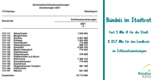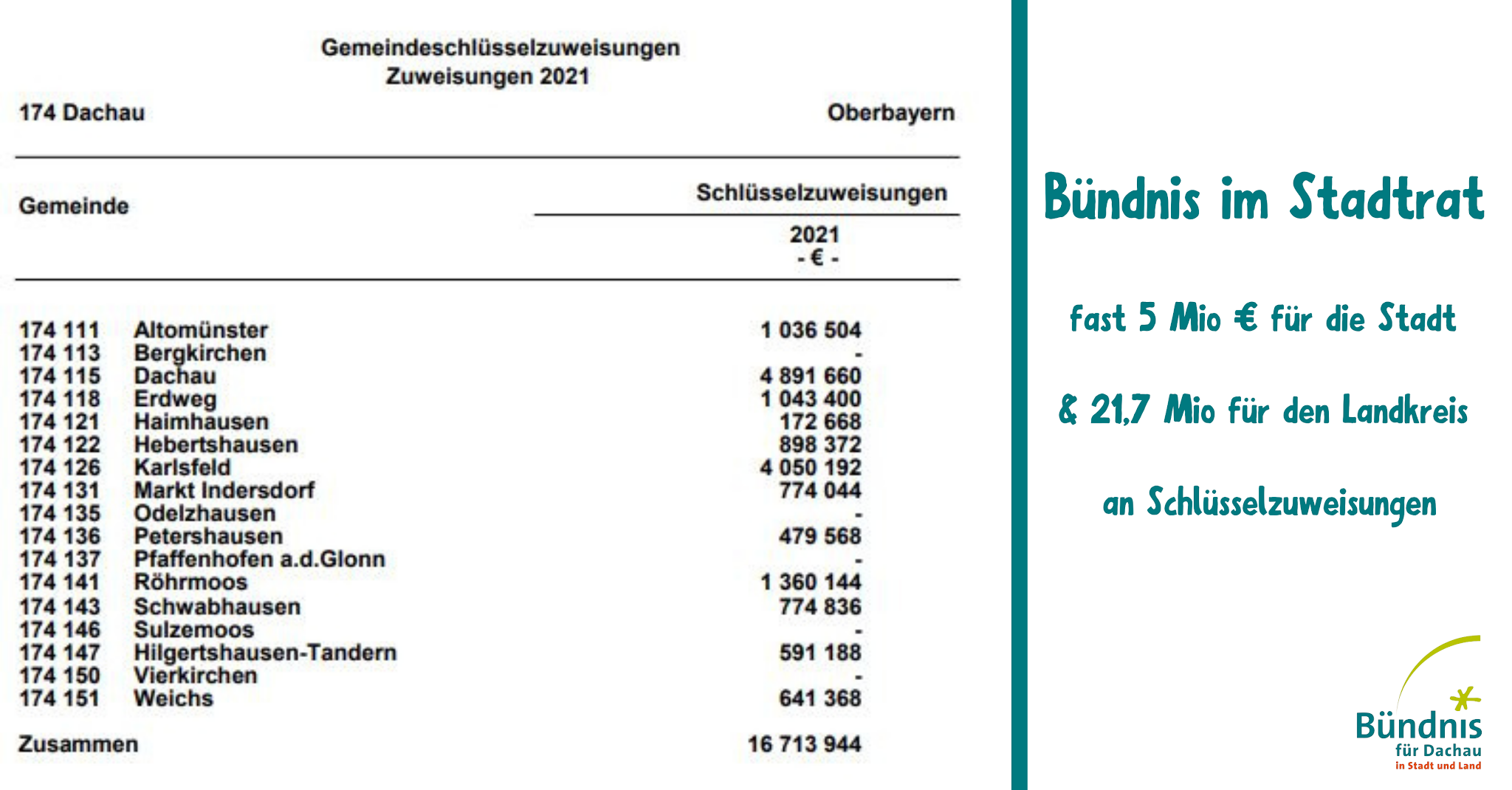 Die Schlüsselzuweisung für den Dachauer Landkreis beträgt 21.668.148 €