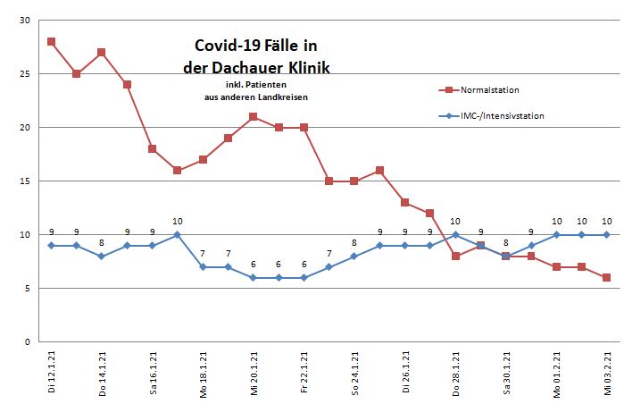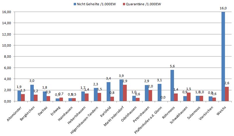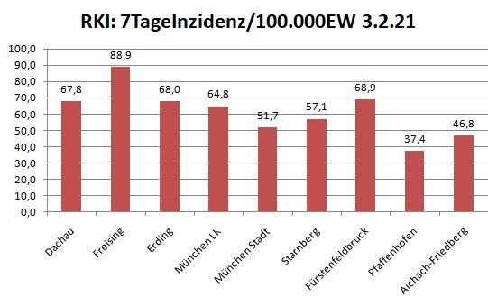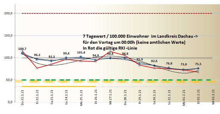Der heutige Mittwoch zeigt uns einen fast übereinstimmenden 7-Tage-Wert. Heute morgen um 00:00h liegen wir laut RKI bei einem Wert von 67,3 tatsächlich liegen wir aber nach den täglichen Meldungen des Dachauer Gesundheitsamtes bei 75,5 insgesamt fehlen in den letzten 7 Tagen dem RKI 38 Fälle.