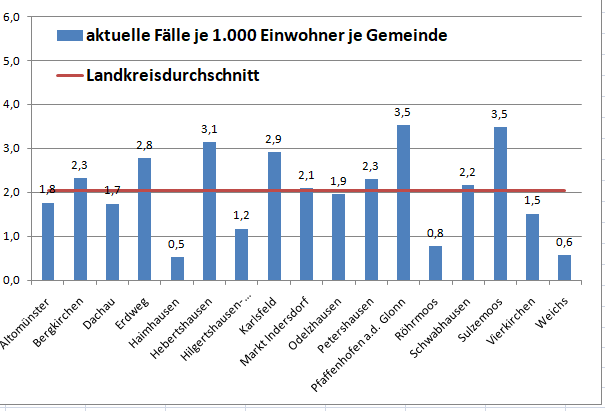 Im Landkreis ist im Moment Pfaffenhofen und Sulzemoos sind die Gemeinden mit der höchsten pro Kopf Zahl an Infizierten, gefolgt von Hebertshausen. Die Stadt Dachau liegt unter dem Schnitt.