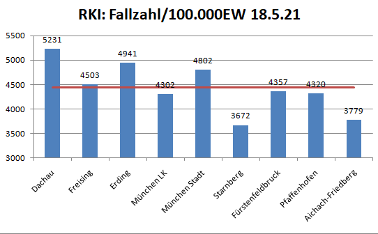 In der langfristigen Betrachtung wird der Landkreis Dachau von der Spitzenpositition nicht mehr wegkommen, zu groß ist der Abstand mit einem Mehr von 800 Fällen gegenüber dem Durchschnitt. Gegenüber dem Landkreis sind es sogar 1559 Fälle mehr pro 100.000 Einwohner.