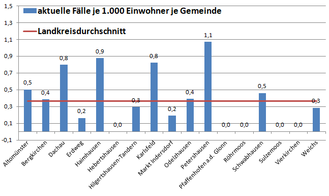 Im Landkreis sind im Moment Petershausen und Haimhausen die Gemeinden mit der höchsten pro Kopf Zahl an Infizierten. Der Schnitt liegt jetzt bei 0,4 Fällen pro 1.000 Einwohner. Letzte Woche waren es noch 0,6.