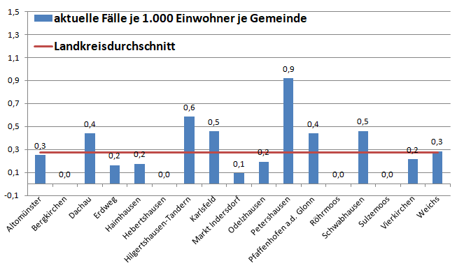 Im Landkreis sind im Moment Petershausen und Hilgertshausen-Tandern die Gemeinden mit der höchsten pro Kopf Zahl an Infizierten. Der Schnitt liegt jetzt bei 0,3 Fällen pro 1.000 Einwohner. Letzte Woche waren es noch 0,4.