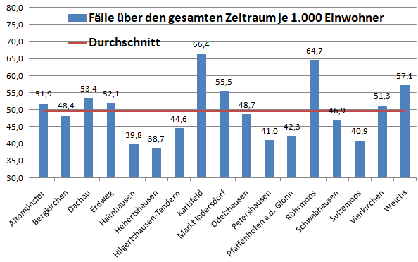 In der Gesamtschau waren die Gemeinden Karlsfeld und Röhrmoos bisher die am stärksten betroffen Gemeinden. Sie liegen deutlich über dem Schnitt von 49,6 Erkrankten pro 1.000 Einwohner.