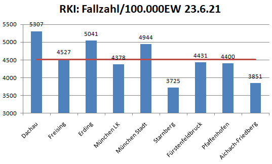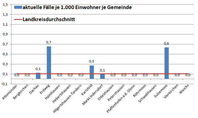 Im Landkreis sind im Moment Erdweg und Sulzemoos die Gemeinden mit der höchsten pro Kopf Zahl an Infizierten. Der Schnitt liegt jetzt bei 0,1 Fällen pro 1.000 Einwohner. Letzte Woche waren es noch 0,2.