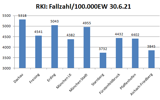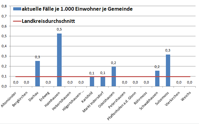 Im Landkreis sind im Moment Haimhausen, Dachau und Sulzemoos die Gemeinden mit der höchsten pro Kopf Zahl an Infizierten. Der Schnitt liegt jetzt bei 0,1 Fällen pro 1.000 Einwohner.