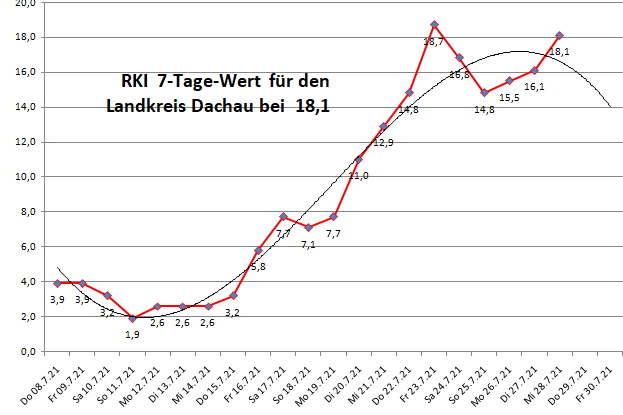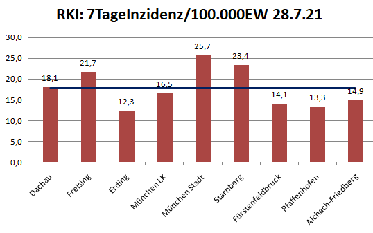 Der Landkreis Dachau liegt diese Woche mit 18,1 leicht über dem Mittel der Nachbarlandkreise (17,8).