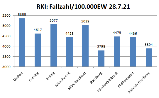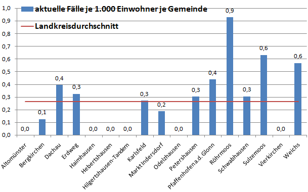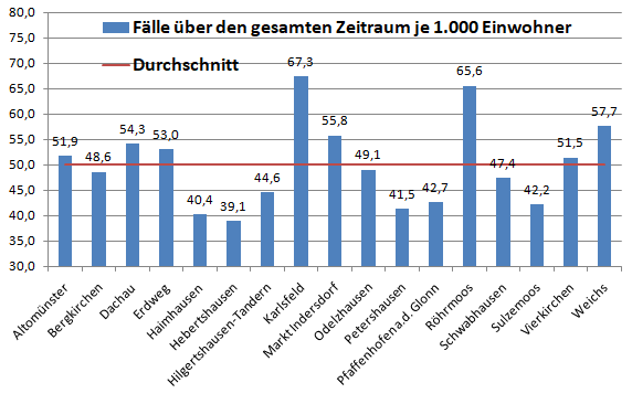 In der Gesamtschau waren die Gemeinden Karlsfeld und Röhrmoos bisher die am stärksten betroffen Gemeinden. Sie liegen deutlich über dem Schnitt von 50 Erkrankten pro 1.000 Einwohner. Warum das so ist , bleibt ungeklärt.