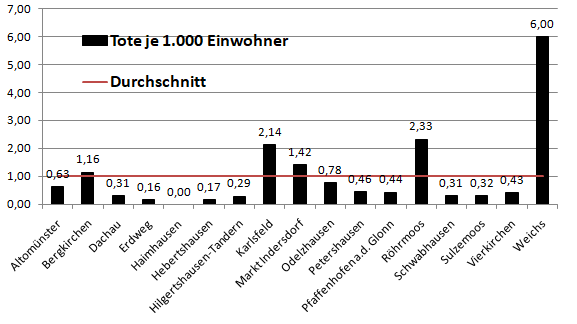 Im Vergleich mit den Nachbarlandkreisen liegen wir bei den Verstorbenen pro 100.000 Einwohner an 2. Stelle hinter Pfaffenhofen. Warum das so ist, bleibt ungeklärt.