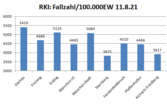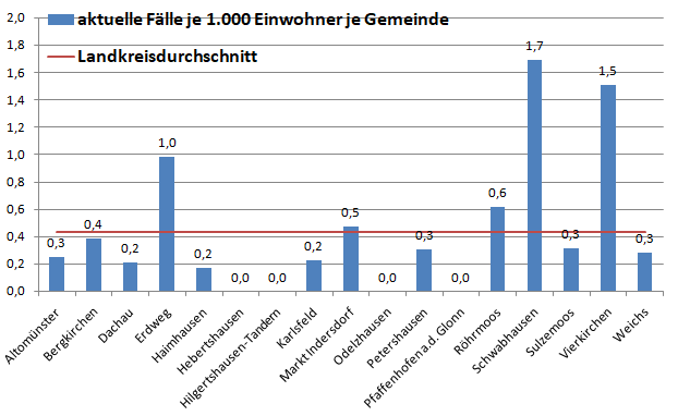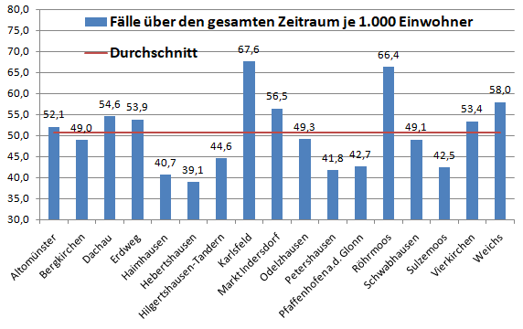 In der Gesamtschau waren die Gemeinden Karlsfeld und Röhrmoos bisher die am stärksten betroffen Gemeinden. Sie liegen deutlich über dem Schnitt von 50,7 Erkrankten pro 1.000 Einwohner. Warum das so ist , bleibt ungeklärt. Das interessiert auch anscheinend niemanden.