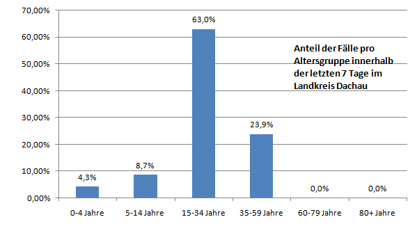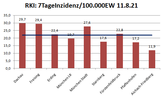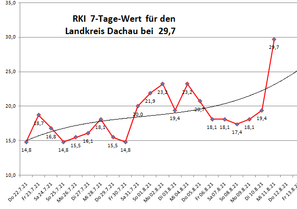 Der Landkreis Dachau liegt diese Woche mit 29,7 gleich auf mit Freising und weit über über dem Mittel der Nachbarlandkreise (22,0).
