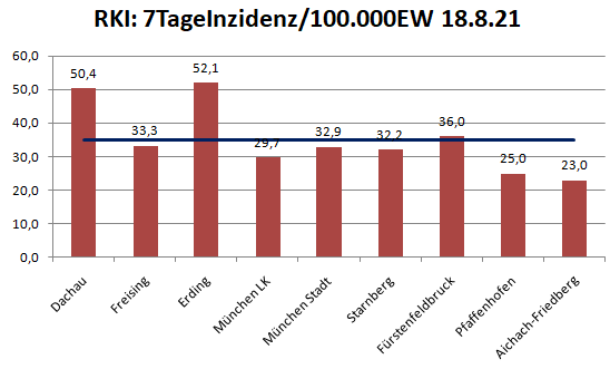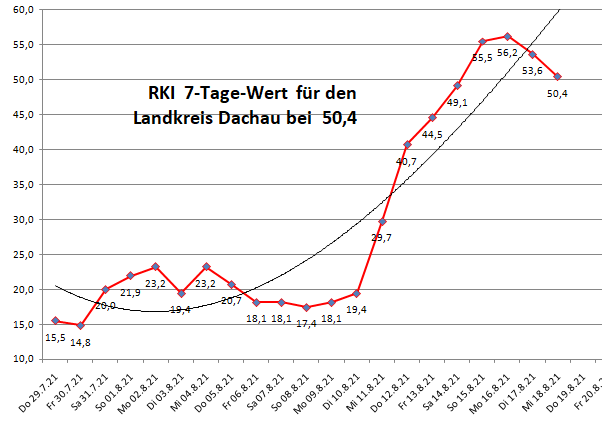 Der Landkreis Dachau liegt diese Woche mit 50,4 etwa gleich auf mit Freising und weit über über dem Mittel der Nachbarlandkreise (35,0).