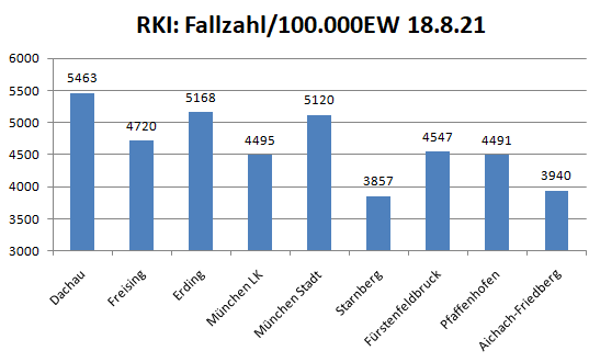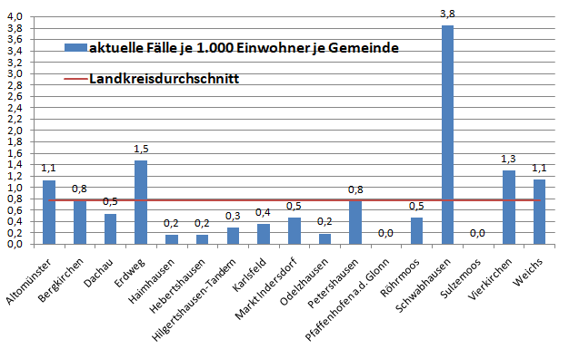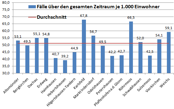 In der Gesamtschau waren die Gemeinden Karlsfeld und Röhrmoos bisher die am stärksten betroffen Gemeinden. Sie liegen deutlich über dem Schnitt von 51,2 Erkrankten pro 1.000 Einwohner. Warum das so ist , bleibt ungeklärt. Das interessiert auch anscheinend niemanden.
