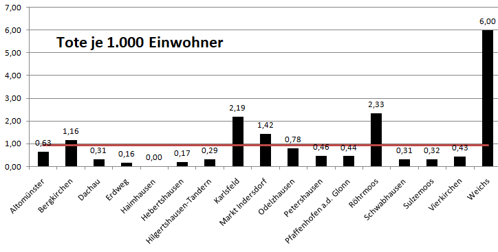 Im Vergleich mit den Nachbarlandkreisen liegen wir bei den Verstorbenen pro 100.000 Einwohner an 2. Stelle hinter Pfaffenhofen. Warum das so ist, bleibt ungeklärt.