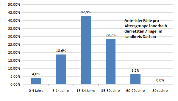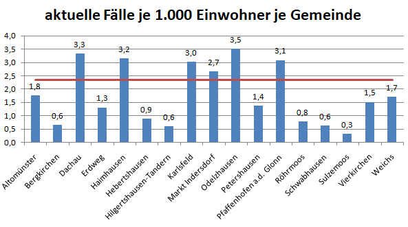 In dieser Woche glücklicherweise keine Änderungen in dieser Grafik. Betrachtet man im Landkreis die einzelnen Gemeinden, so sticht Weichs hervor. Warum das so ist, bleibt ungeklärt.