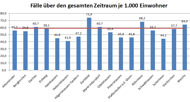 In der Gesamtschau waren die Gemeinden Karlsfeld und Röhrmoos bisher die am stärksten betroffen Gemeinden. Sie liegen deutlich über dem Schnitt von 59 Erkrankten pro 1.000 Einwohner. Warum das so ist , bleibt ungeklärt. Das interessiert auch anscheinend niemanden.