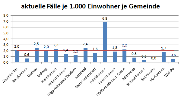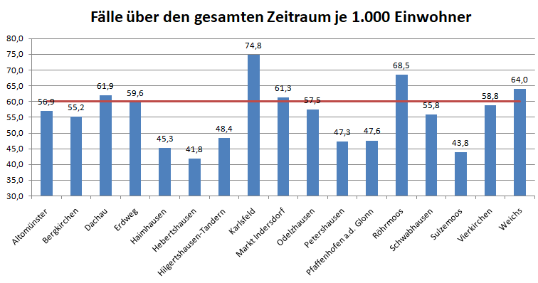 In der Gesamtschau waren die Gemeinden Karlsfeld und Röhrmoos bisher die am stärksten betroffen Gemeinden. Sie liegen deutlich über dem Schnitt von 60 Erkrankten pro 1.000 Einwohner. Warum das so ist, bleibt ungeklärt. Das interessiert auch anscheinend niemanden.