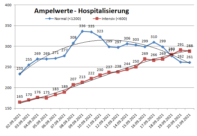 Die Zahl der Intensivpatienten (rot) in Bayern stieg die letzten Wochen kontinuierlich an. Der aktuellste veröffentlichte Stand ist von gestern, die aktuellsten Werte gibt es immer erst am Nachmittag.