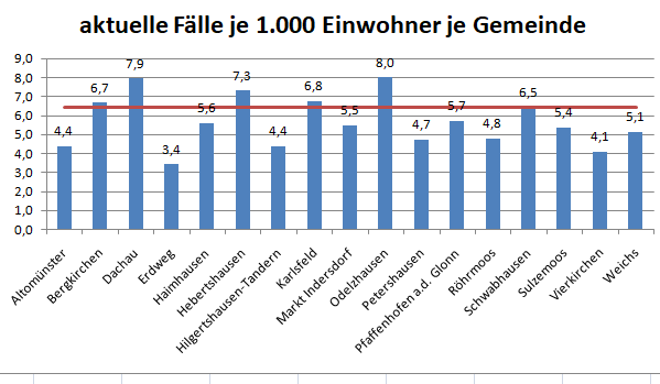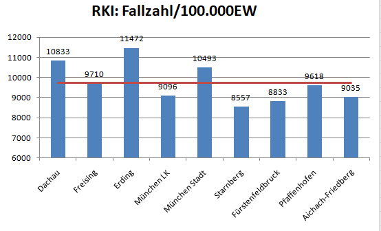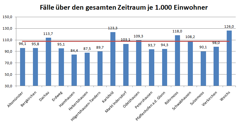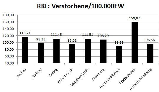 Im Vergleich mit den Nachbarlandkreisen steht nur Pfaffenhofen bei den Verstorbenen pro 100.000 Einwohner noch schlechter da als der Landkreis Dachau. Deutlich geringer ist der Wert für den Nachbarlandkreis Fürstenfeldbruck.
