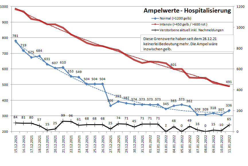 Es werden keine Maßnahmen mehr aus der Hospitalisierungs-Ampel abgeleitet, im Prinzip wurde sie aus dem Verkehr gezogen. Dennoch sehen wir, dass bei steigender Inzidenz die Belegung der Intensivbetten zurückgeht. Bisher konnte man immer mit 2 Wochen Verzögerung rechnen, ob die gegenläufige Tendenz Bestand hat sehen wir also erst nächsten Mittwoch.