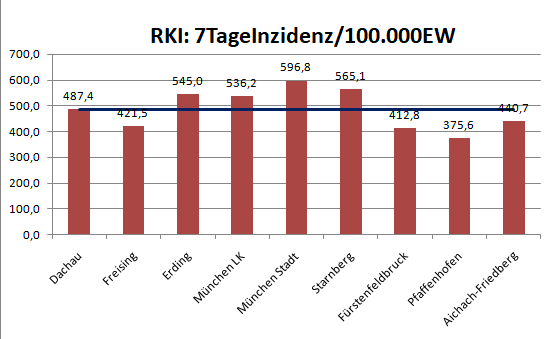 Der Landkreis Dachau liegt diese Woche mit einer Inzidenz von 487,4 ( Vorwoche 232,1) im Mittel der Nachbarlandkreise mit 486,8.